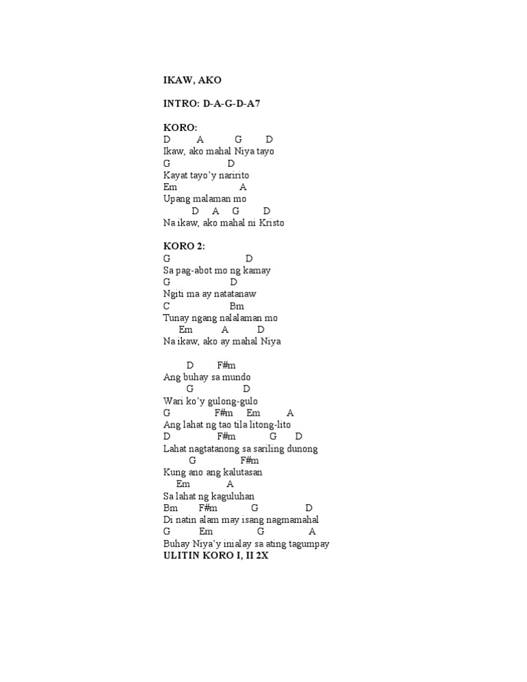 D Ikaw A ako ma Bm hal niya Fm tayo K G ayat tayoy nari D rito N Em ais nyang A malaman mo Na D ikaw A ako ma Bm hal ni Kr Fm isto Sa p G ag-abot ng iyon DF g kamay Ng G iti mo ay nat DF atanaw N G adarama ko n DF gang tunay Em A D A Na ikaw ako ay mahal niya. Mahal Ka Ng Dios. Nadarama ko ng tunay.